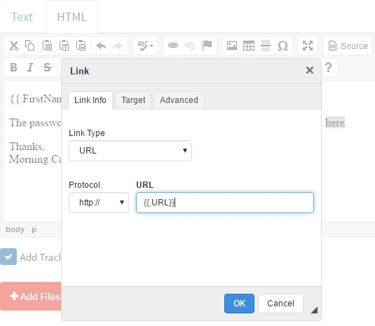 Speaking of links, now we need to add our phishing link. Highlight the word "here" and click the chain icon in the menu, exposing the "Link" dialog. In this dialog, we'll set the link to {{.URL}}