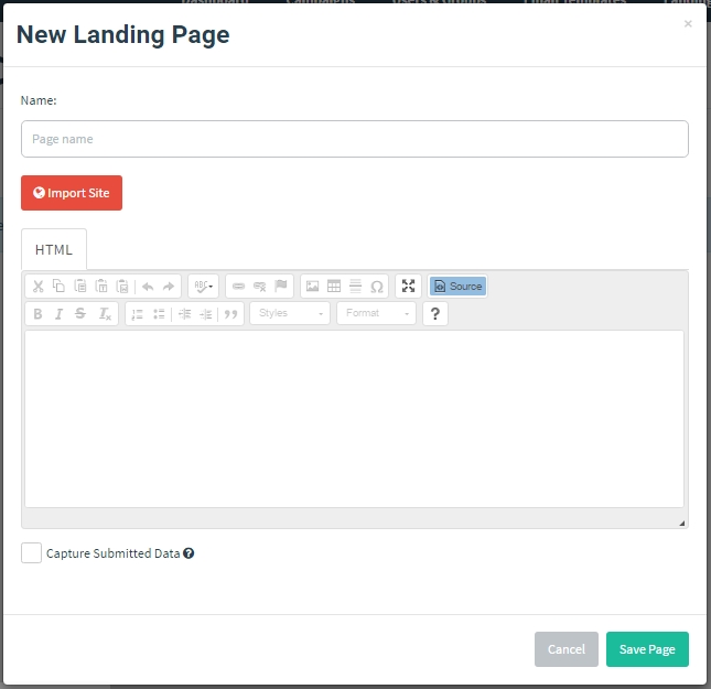 Landing pages support templating, capturing credentials, and redirecting users to another website after they submit their credentials.